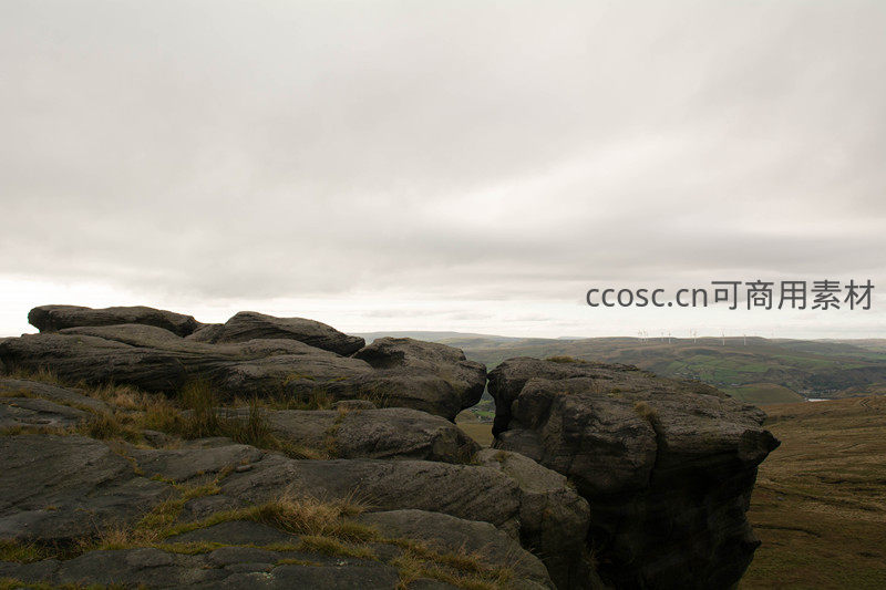 在灰蒙蒙的天空下,嶙峋的黑色岩石遍布山坡,远处山谷中点缀着几座白色风力发电机,构成一幅宁静而苍凉的自然画卷。