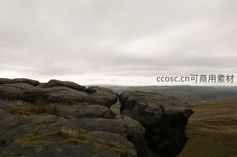 厚重的云层笼罩着大地,前景是形态各异的巨大岩石,缝隙间长出稀疏草丛,背景中风车静静伫立于广袤原野之上,营造出孤寂而壮阔的氛围。