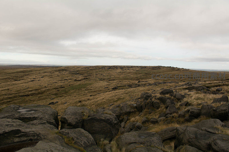 广袤的荒原上,深色巨石散落于枯黄草甸之间,远处地平线与灰白天空相接,展现出原始而苍凉的自然风貌。