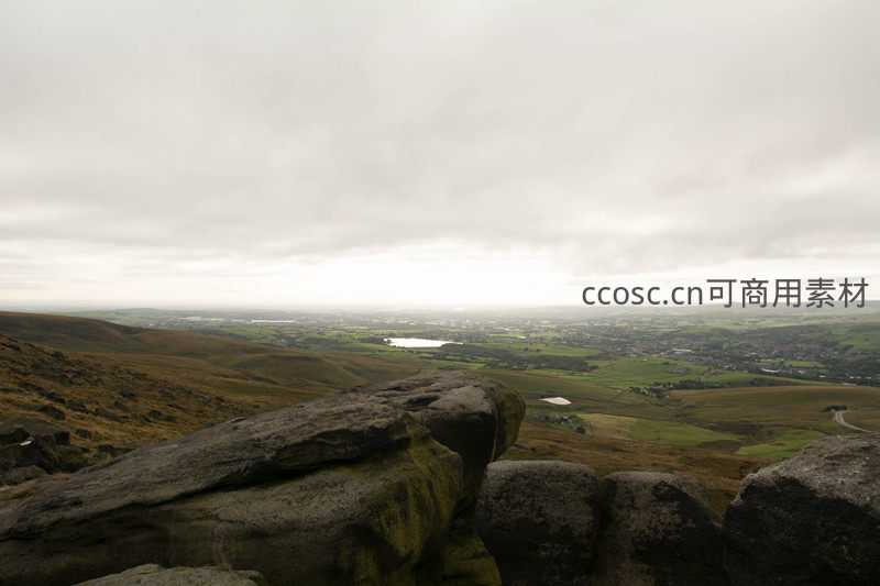 厚重云层低垂笼罩大地,下方是连绵起伏的绿色丘陵与散布其间的小镇,前景粗犷岩石形成天然画框,意境开阔悠远。