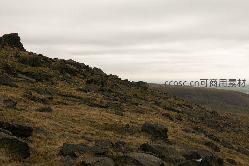 坡度陡峭的山体上遍布被风霜侵蚀的岩石,夹杂着稀疏干草,在灰白天空映衬下更显原始粗犷,仿佛亘古未变的大地肌理。