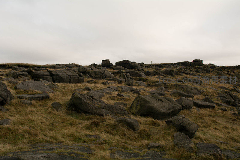 山脊线上布满形态各异的黑色岩石,其缝隙中顽强生长着枯黄野草,灰蒙天空下构成一幅未经雕琢的自然画卷,充满野性与生命力。