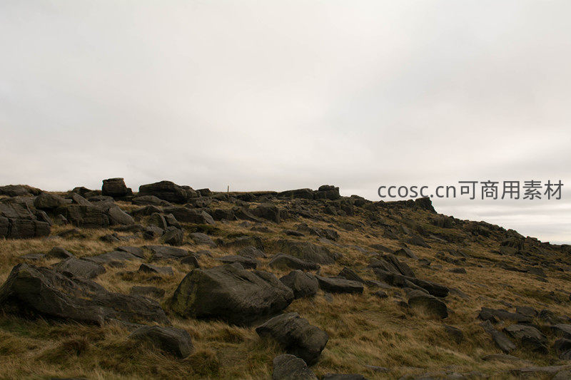 阴天下的荒野山坡,遍布巨大深色岩石,其间点缀着枯黄的野草,展现出原始而苍凉的自然风貌。