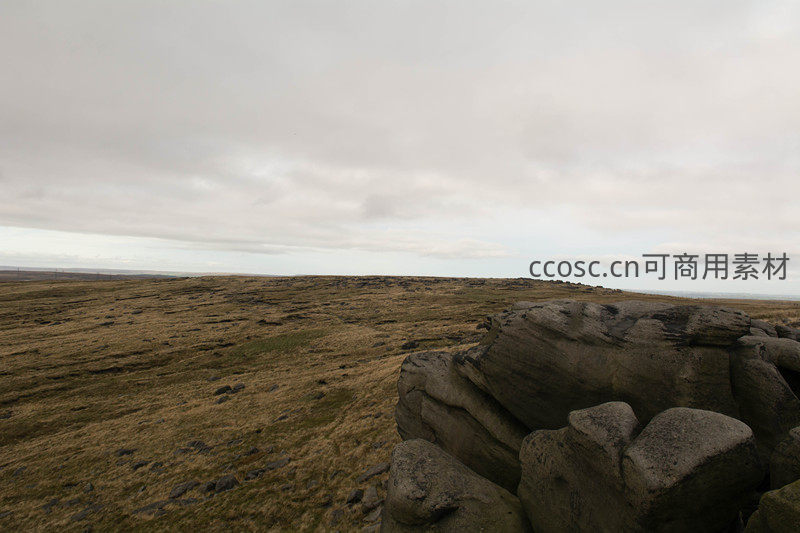 广袤无垠的荒原上,巨大的岩石群在阴沉云层下静默矗立,枯黄草地延伸至天边,营造出苍凉而壮阔的自然意境。