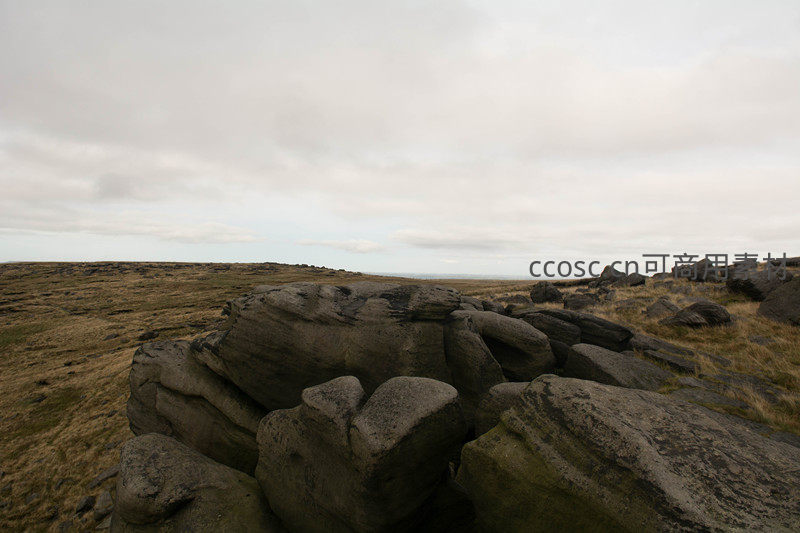 嶙峋的岩石如古老卫士般排列在枯黄草原边缘,灰白天空低垂,整个画面弥漫着原始、粗犷且宁静的自然力量感。