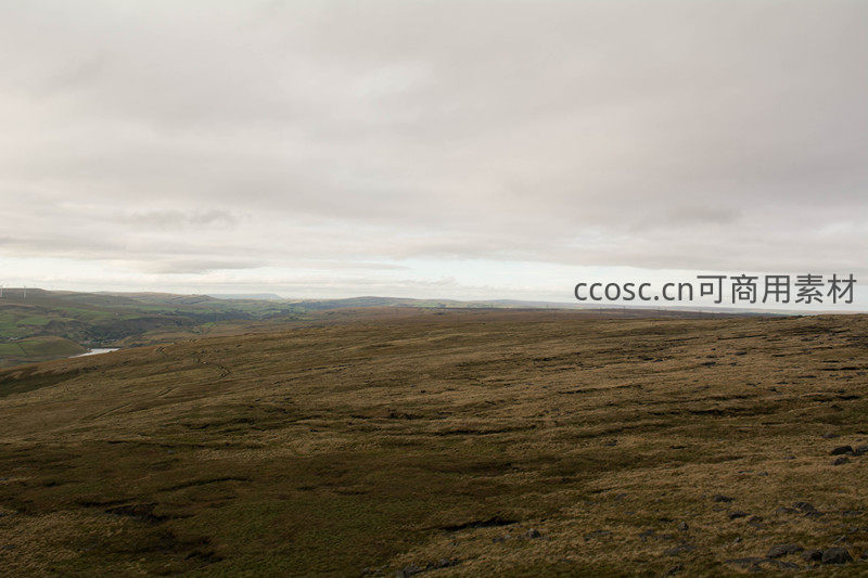 连绵起伏的荒原在低垂云幕笼罩下显得格外苍茫,远处隐约可见山谷与水体,整体色调沉郁,充满史诗般的地理质感。
