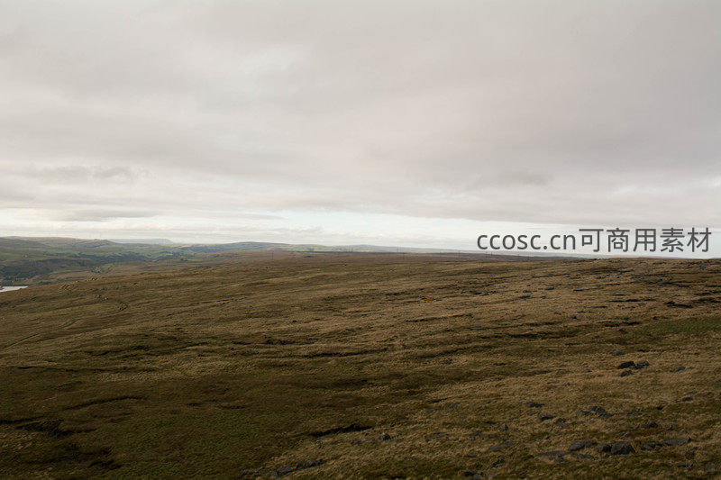 大片枯黄草原在阴云密布的天空下向地平线无限延伸,地面沟壑纵横,远山朦胧,呈现出一种静谧而略带萧瑟的自然画卷。