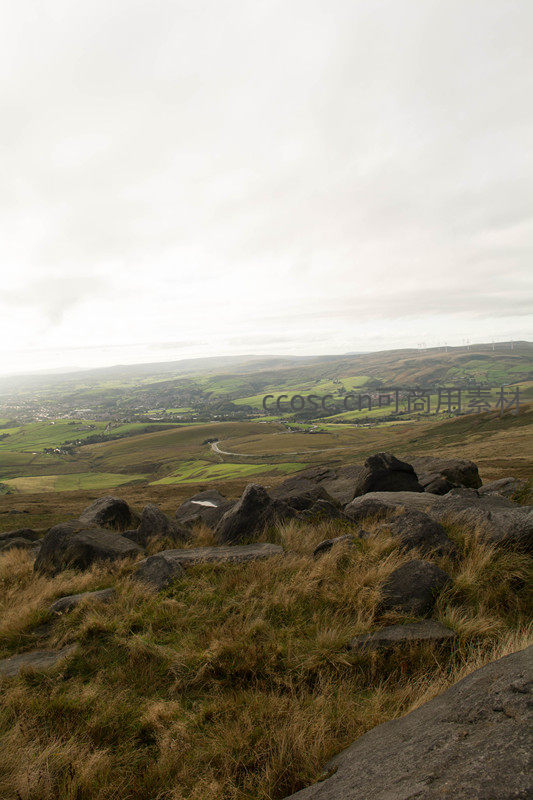 厚重云层下,视野开阔,山脚下的村庄、田野与蜿蜒小路尽收眼底,展现大地的辽阔与静谧之美。