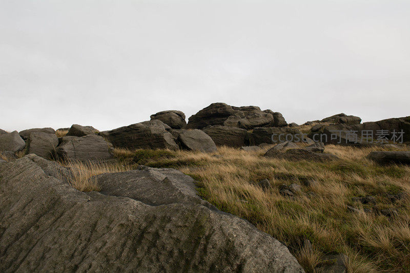 镜头贴近地面,捕捉到荒原上饱经风霜的巨石群,粗糙纹理与枯黄草丛交织,展现出原始而粗犷的自然力量。