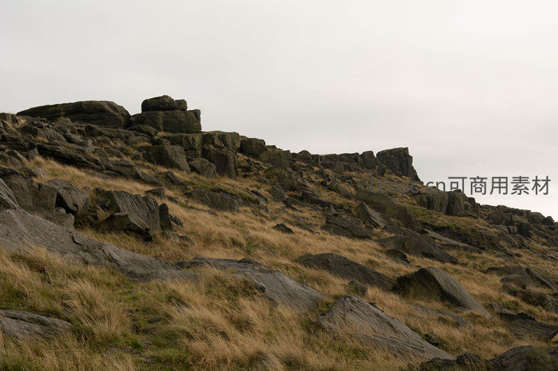 倾斜的山坡上,深色岩壁与金黄枯草相依共生,在灰蒙天空下形成富有层次感的自然肌理,散发质朴野性之美。