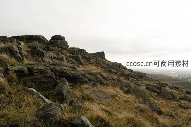 山脊线上布满嶙峋的岩石,脚下是随风摇曳的枯草,远方平原在灰白云层下若隐若现,营造出宁静而辽阔的视觉感受。
