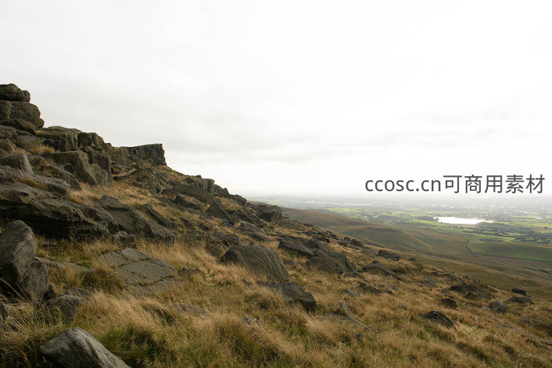站在陡峭的山崖边缘,眼前是层层叠叠的岩石与枯草,远方平原绿意盎然,湖泊点缀其间,构成一幅气势恢宏的自然画卷。
