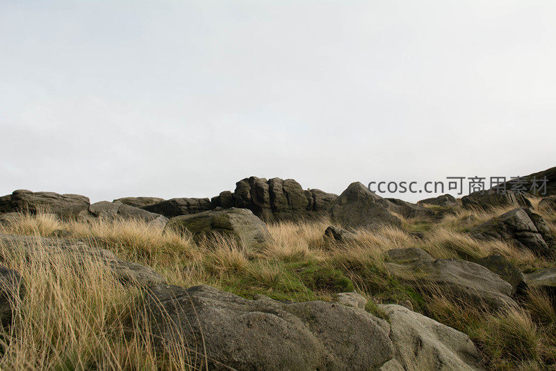 低角度仰拍下,巨大的岩石群在灰白色天空的映衬下更显雄伟,金黄色的野草在风中摇曳,营造出宁静而原始的氛围。
