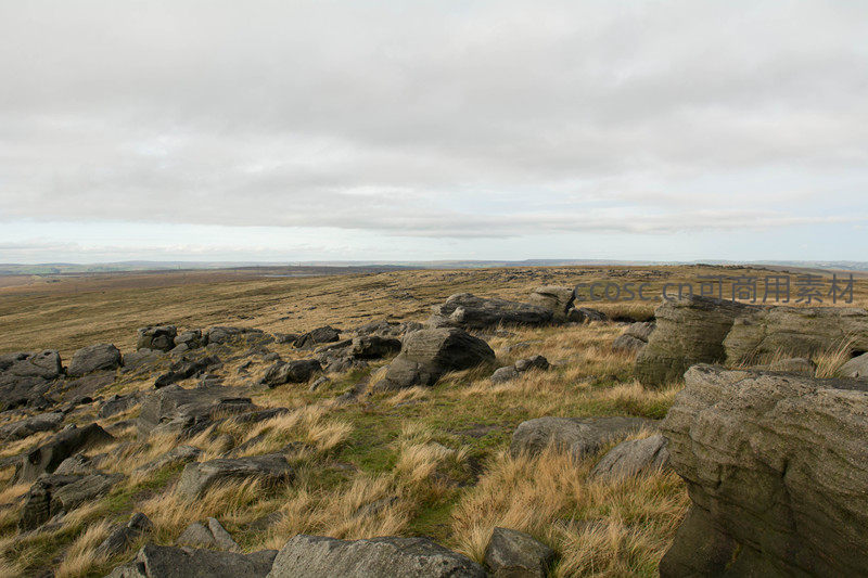 广袤的荒野上,巨大的岩石散落于枯黄的草丛间,灰白的天空下展现出原始而苍凉的自然风貌,令人感受到大地的沉寂与壮阔。