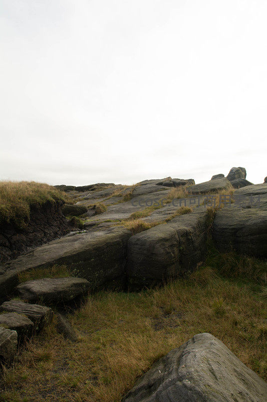 层叠岩石与稀疏绿草的山地特写