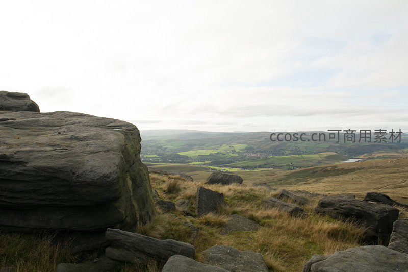 前景巨大的岩石如天然画框,框住远处起伏的绿色山谷与宁静村落,点缀其间的风力发电机为这片田园风光增添现代工业的和谐印记。