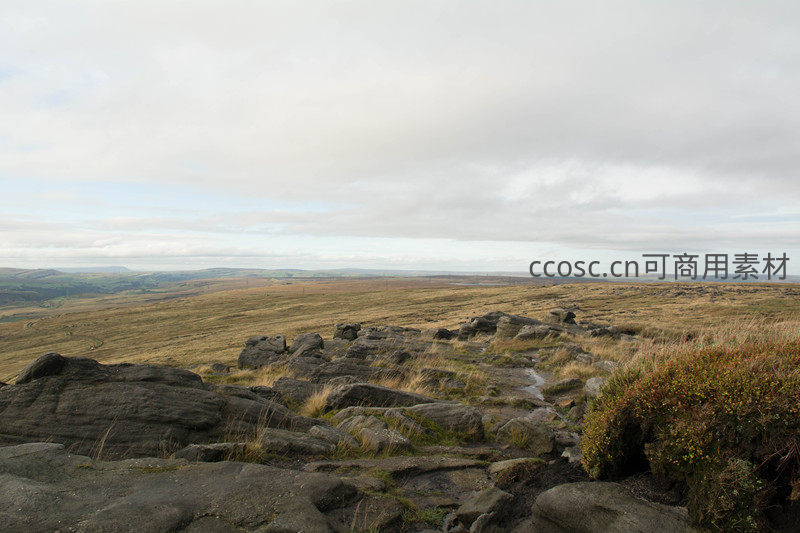 广袤高原上,深灰色岩石错落分布于枯黄草地间,远方天际线模糊,云层低垂,营造出苍凉辽远的视觉氛围。