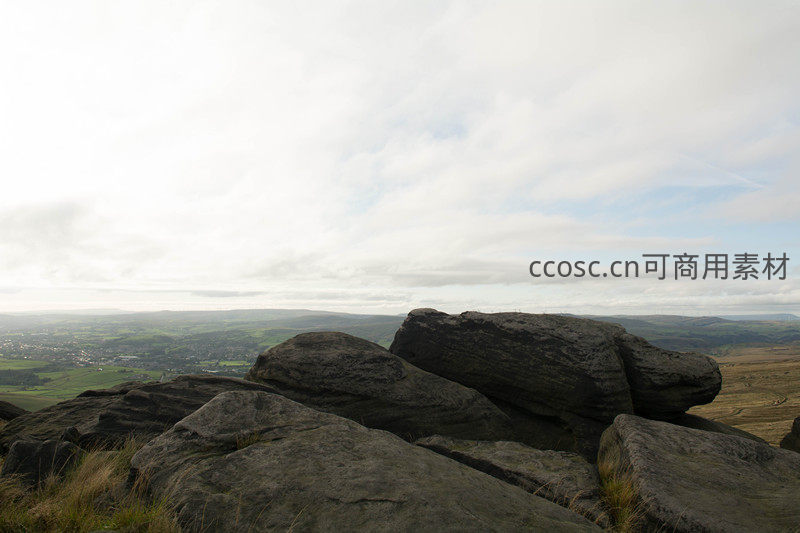 高耸的黑色巨石矗立在山顶,俯瞰着下方辽阔的山谷与连绵起伏的丘陵,天空中云层密布,营造出一种苍凉而壮丽的自然氛围。