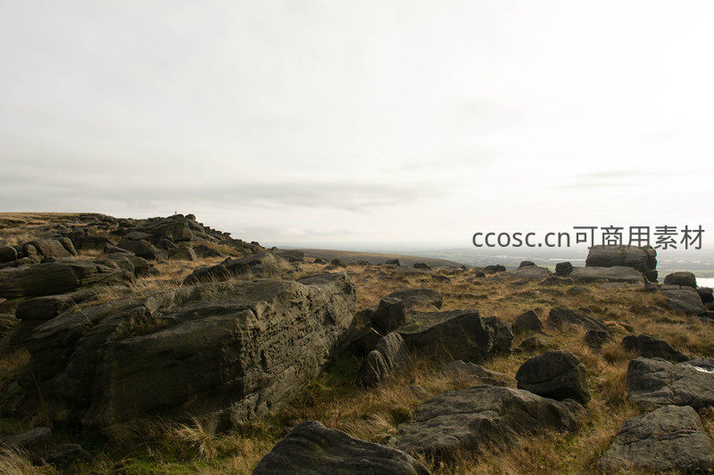 沿着山脊线分布的大小不一的岩石,在灰白色的天空下显得格外突出,远处视野开阔,一片苍茫,仿佛置身于天地之间,感受自然的浩瀚。