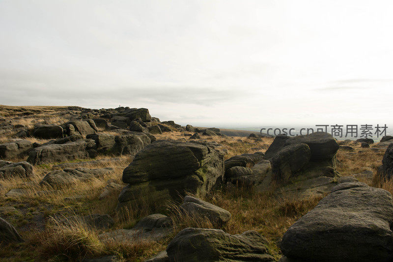 前景是布满巨大岩石的崎岖地面,覆盖着干枯的草甸,视线向远方延伸,可见起伏的山丘与灰白天空相接,展现出大地的粗犷与辽阔。
