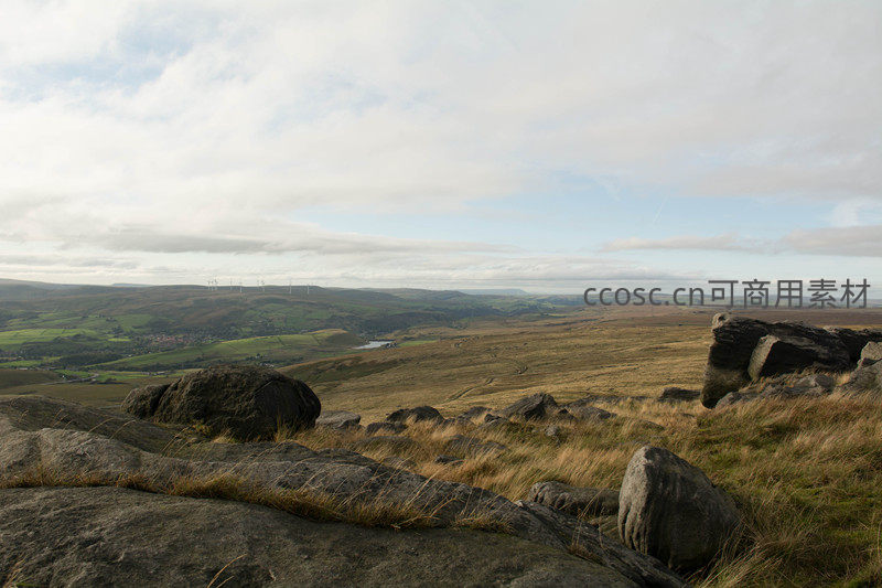站在岩石嶙峋的山顶,可俯瞰下方绿意盎然的山谷与整齐排列的风力发电机,蓝天白云与大地交融,展现人与自然和谐共存的现代田园画卷。