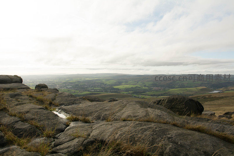 前景的岩石平台上积聚着一汪清水,清晰倒映着远处连绵的绿色田野和城镇轮廓,上方是飘动的云朵,构成一幅层次丰富、动静结合的自然人文图景。