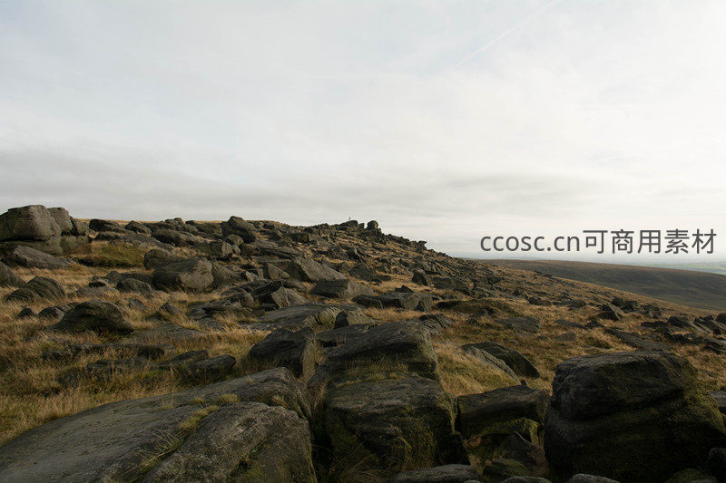 起伏的山坡上散落着大小不一的深色岩石,干枯草甸延伸至远方,天空灰白,营造出苍凉而壮阔的自然景象。