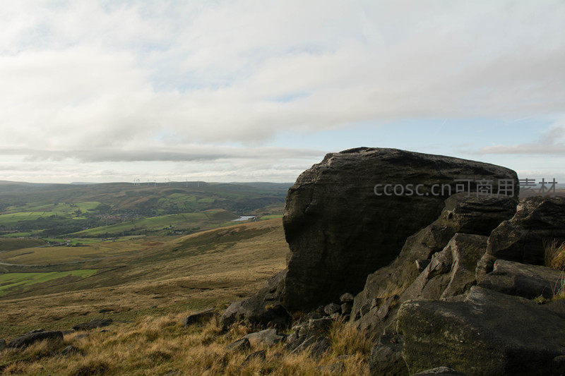 前景是粗犷的深色岩块,背景是开阔的绿色山谷和零星分布的风车,在多云天空下形成强烈对比,展现自然原始之美。