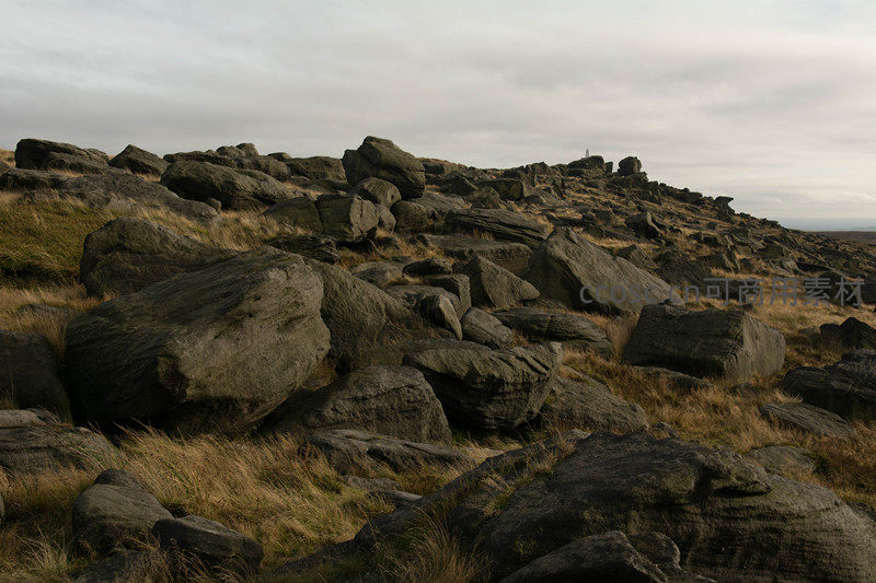 层层叠叠的巨岩散落在缓坡之上,覆盖着稀疏的枯草,天空灰白,光线柔和,整个画面充满原始、静谧的自然气息。