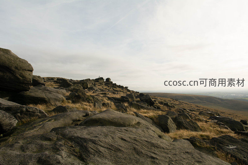 崎岖的巨石覆盖着山坡,枯黄草丛点缀其间,远处是开阔的平原和朦胧天际线,展现了大自然的原始与辽阔。