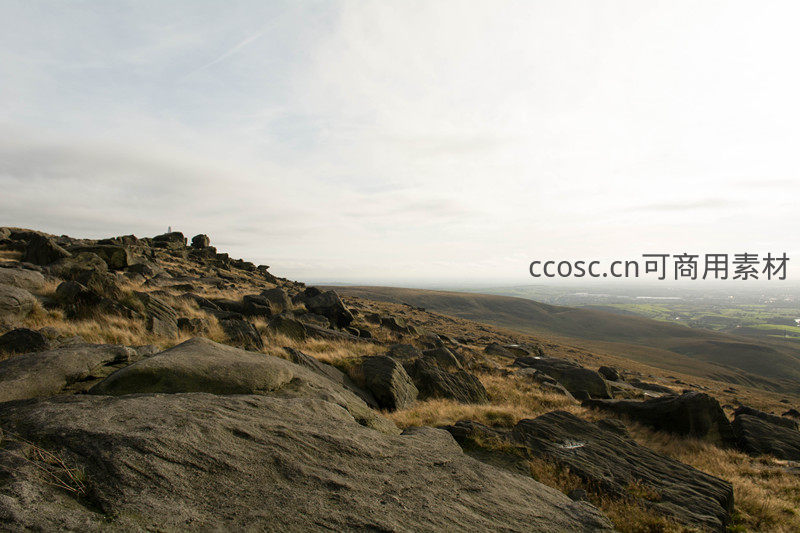 在布满巨岩的山脊上,一个渺小人影伫立远眺,脚下是无垠的原野与云层低垂的天空,凸显人与自然的对比与和谐。