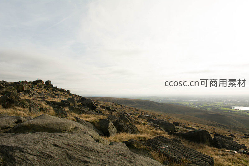 薄雾笼罩下的岩石坡地延伸向远方,隐约可见绿色田野与一汪湖泊,天空柔和,整个画面充满静谧诗意的自然之美。
