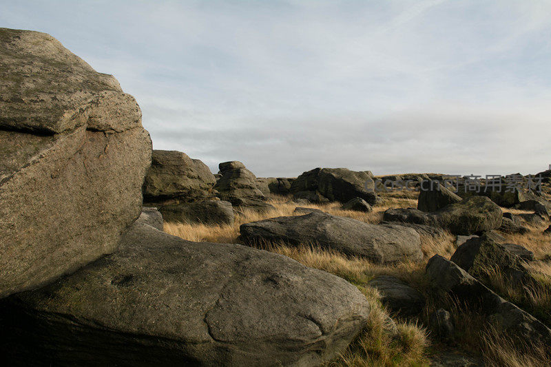 特写巨岩纹理与枯草交织的荒野细节