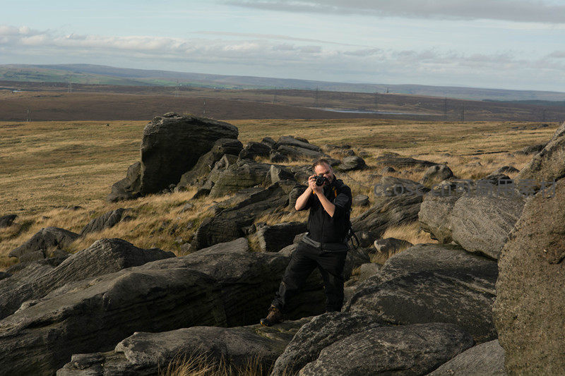 一名摄影师身着黑色户外装,站在崎岖的岩石上,手持专业相机专注拍摄远方的辽阔原野,背景是连绵起伏的丘陵和多云天空。
