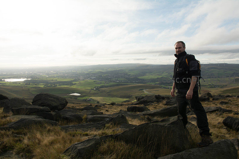 一名背包客站在崎岖的山顶岩石上,身后是延绵起伏的绿色田野和远处的城镇,天空云层密布,展现出壮丽的自然景观。