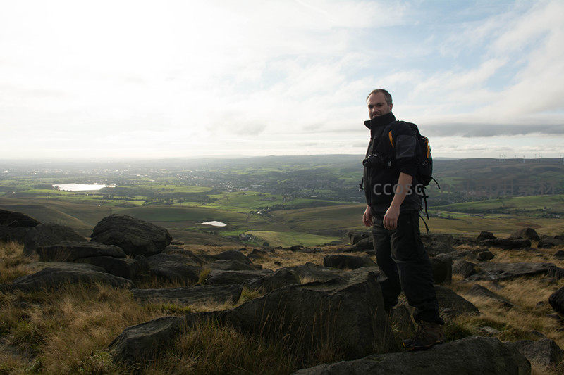 一位穿着专业户外装备的男子伫立在山巅,背景是开阔的山谷与村庄,展现了人与自然和谐共处的宁静时刻。