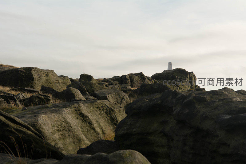 在崎岖不平的山巅之上,巨大的深色岩石与枯黄草甸交织,一座醒目的白色三角测量点静立于最高处,成为这片荒野中唯一的现代人工标记。