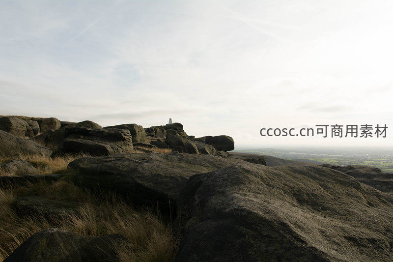 从布满嶙峋巨石的山顶远眺,视野豁然开朗,下方是朦胧的平原与城镇轮廓,头顶是广阔而略带薄云的天空,尽显大自然的雄浑与辽阔。