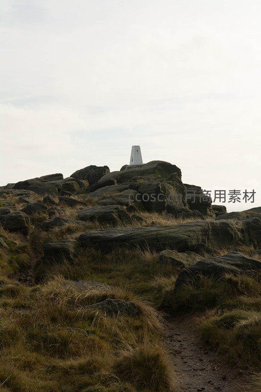 一条泥泞的小路穿过覆盖着苔藓的岩石和干枯的草丛,蜿蜒向上,最终指向山顶那座标志性的白色三角测量塔,仿佛在邀请人们去探索这片高地。