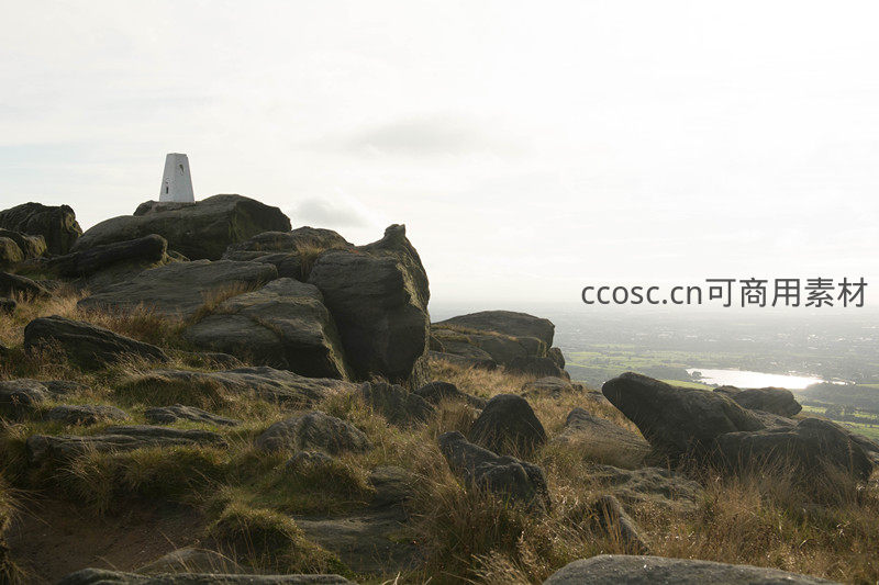 站在山顶的测量三角点旁,眼前是层层叠叠的丘陵与平原,远处城镇与河流交织,近处岩石与干草相映,构成一幅融合自然与人文的宏大风景画卷。