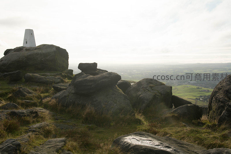 在开阔的山顶上,巨大的岩石散落其间,一座白色的三角测量塔矗立其上,俯瞰着远方连绵起伏的丘陵与城镇,天空云层稀薄,景色辽阔而宁静。