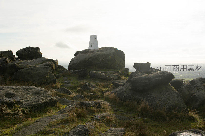 荒凉的山巅之上,嶙峋的黑色巨石与青翠草甸交织,一座醒目的白色测量塔成为视觉焦点,背景是朦胧的城市轮廓和广阔的天空,充满探索与冒险的气息。