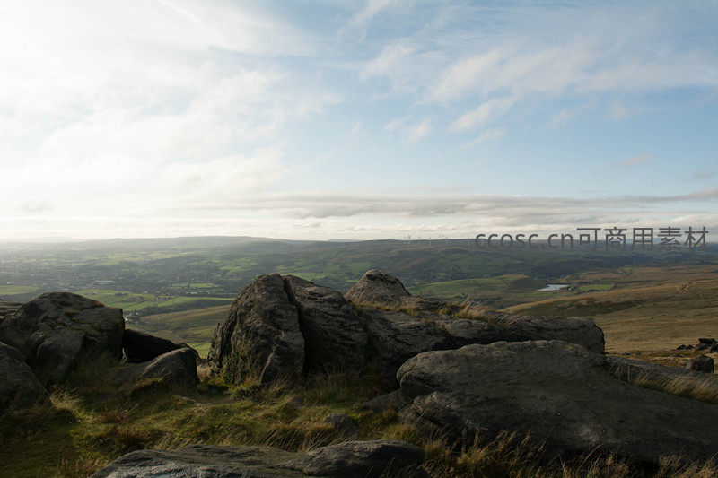 崎岖的岩石山脊在前景中矗立,后方是连绵起伏的丘陵与翠绿田野,远处风车静静旋转,构成一幅宁静而辽阔的乡村全景画卷。