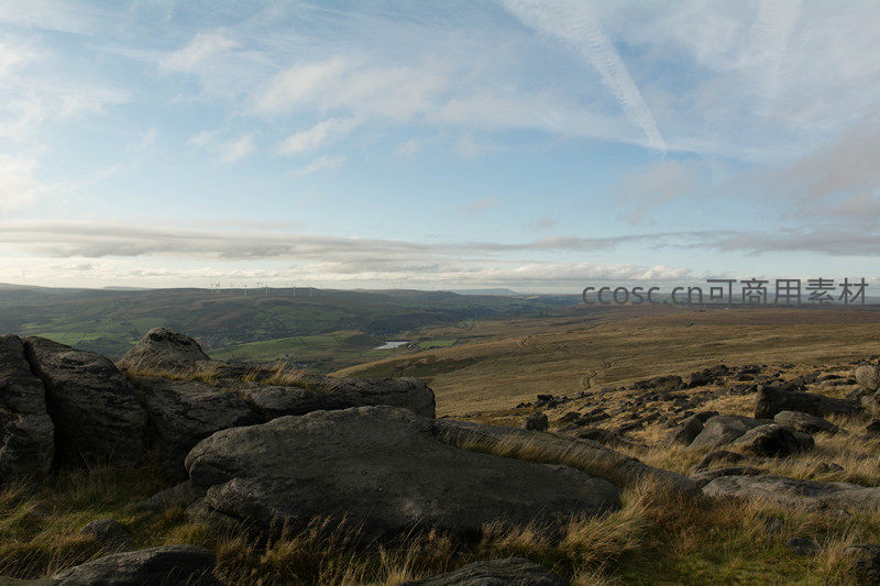 站在高原巨岩之间,视野豁然开朗,脚下是金黄与翠绿交织的广阔平原,远方风车林立,天空中飞机划过留下白色航迹,充满自由与探索的气息。