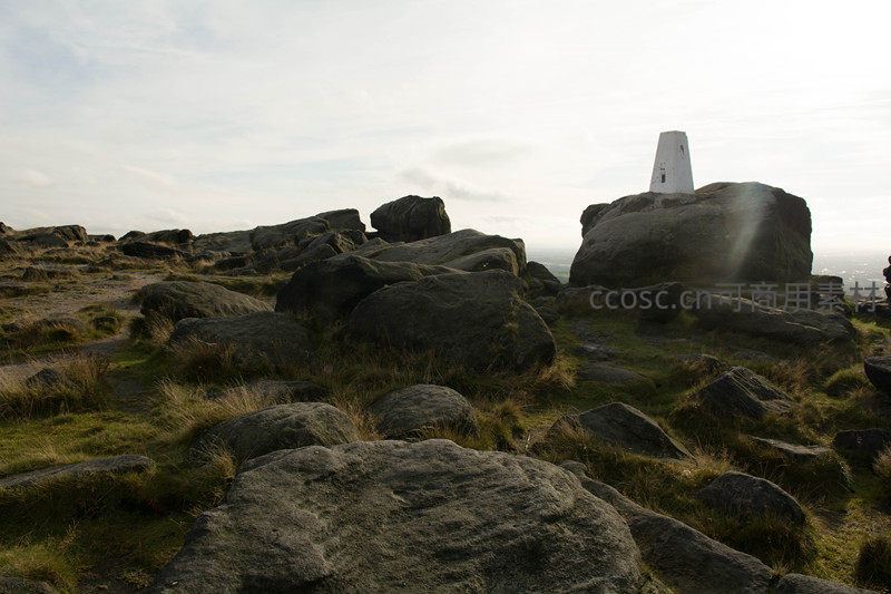 一座白色的三角测量点标志矗立在布满巨石的山顶,四周草色枯黄,远处城市轮廓隐约可见,象征地理测绘与自然探索的交汇点。