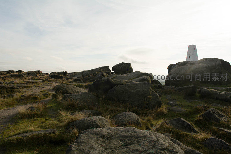 在开阔的山顶,巨大的岩石散布在草地上,一座白色的三角测量塔矗立其上,远眺山谷与云天相接,景色壮丽而宁静。