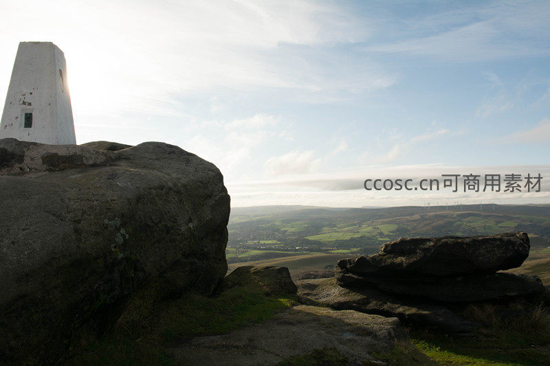 白色测量塔坐镇山巅,阳光洒落,脚下是起伏的绿色田野与远处风力发电机,展现人与自然和谐共存的广阔画卷。