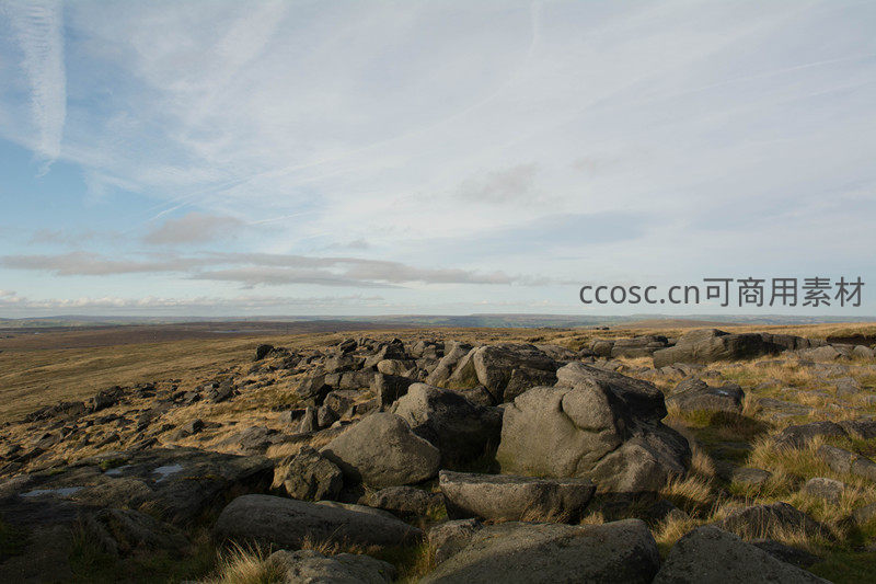 在开阔的高原上,巨大的岩石群散落于枯黄草甸之间,远处是连绵起伏的山丘与朦胧的地平线,天空飘着几缕薄云,尽显苍凉壮阔。