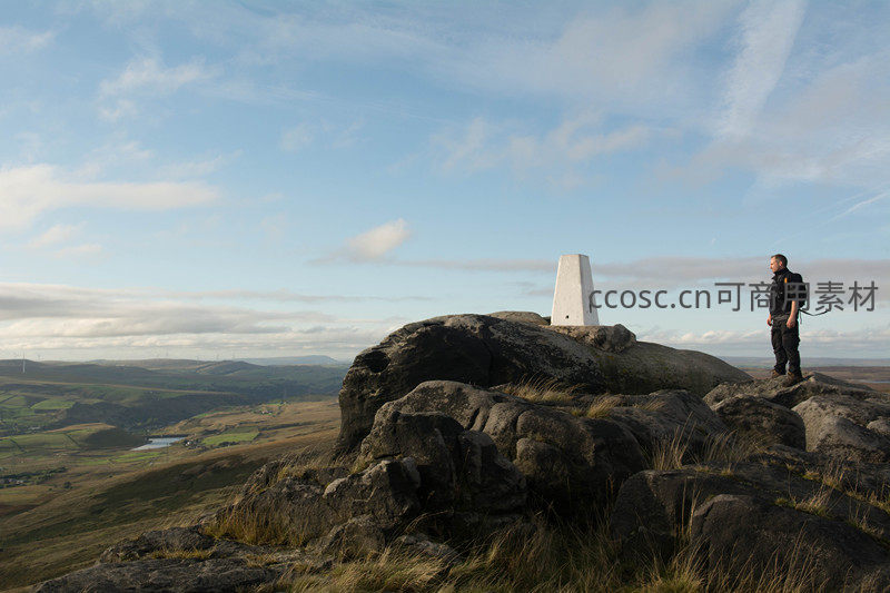 一名背着登山包的旅行者静立在布满岩石的山巅,身旁是标志性的白色三角点,他凝视着脚下广袤的山谷与远处的风力发电机,享受宁静时刻。