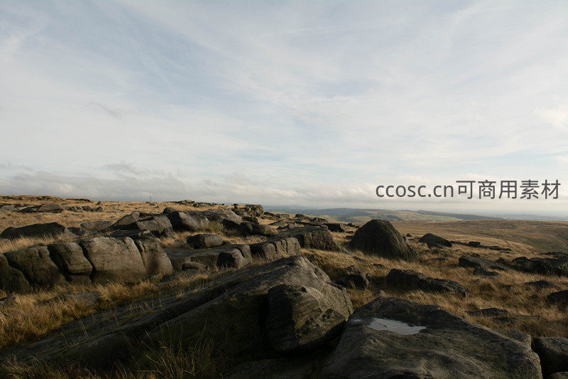 在多云天气下,山脊上的巨大岩石群错落有致,枯草点缀其间,向远处延伸的丘陵与平原一览无余,呈现出一种沉静而宏大的荒野气息。